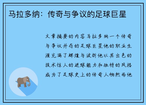 马拉多纳作为传奇与争议并存的足球巨星,他的生涯充满了辉煌与波折,他的足球天赋和独特风格让人叹为观止,但与此同时,他的职业生涯也伴随着各种争议和纷争。然而,无论是他的光辉时刻还是他的挣扎与困惑,马拉多纳都将永远被铭记在足球史册上,成为了一代传奇。